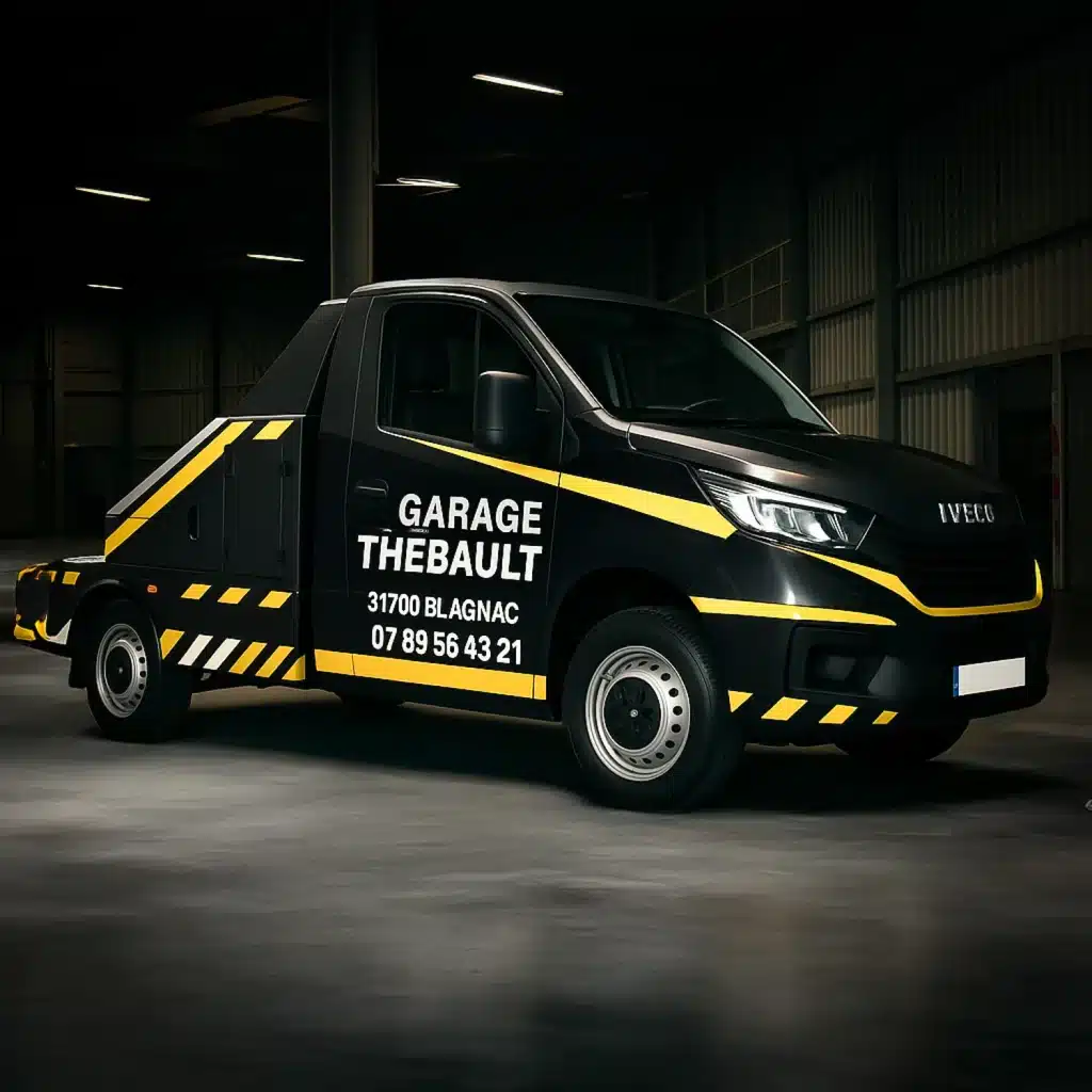 Nous intégrons aussi vos contraintes de visibilité réglementaire (bande réfléchissante, numéro d’urgence, logo clairement identifiable), afin que votre dépanneuse soit à la fois conforme, professionnelle et percutante visuellement.
