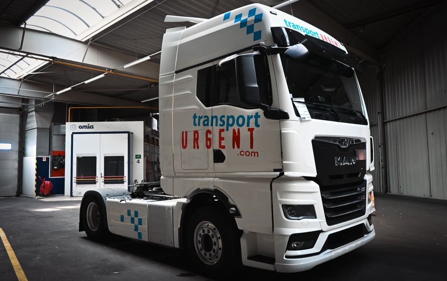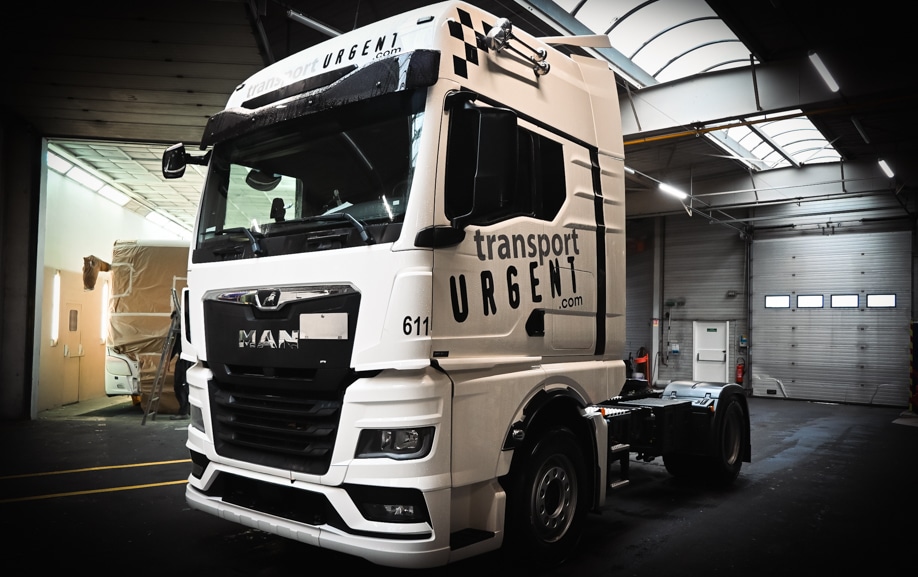 Les éléments graphiques « Transport Urgent » ont été retravaillés pour s’intégrer précisément aux géométries des cabines MAN. Les textes ont été positionnés sur la casquette, le pare-brise, les flancs et les angles supérieurs afin d’assurer une lecture claire à distance et en mouvement.