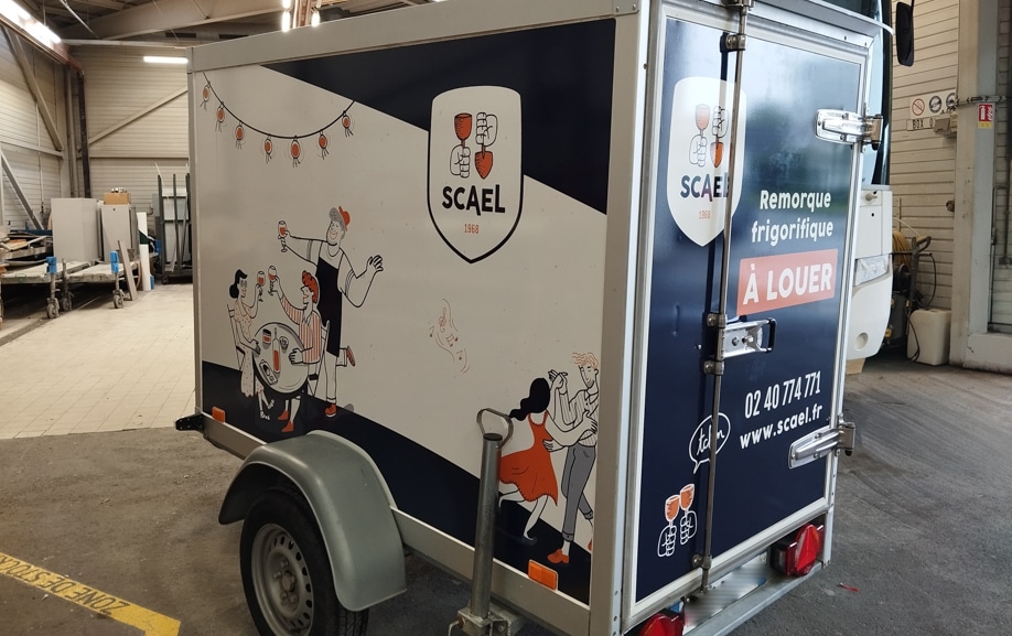 À Nantes, l’enseigne SCAEL, connue pour ses espaces mêlant jardinerie, cave et bar, propose également un service de location de remorques frigorifiques destiné aux professionnels comme aux particuliers. Pour soutenir ce service et attirer l’attention lors des déplacements ou sur les parkings d’événements, l’entreprise a choisi d’habiller l’une de ses remorques avec un covering de remorque professionnelle impactant.
