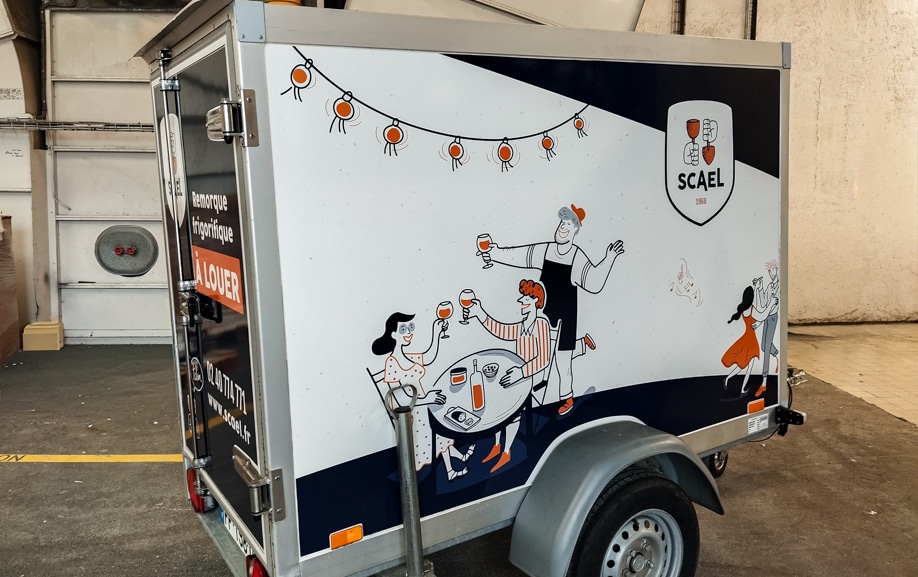 Cependant, une remorque utilitaire reste souvent un support neutre, peu exploité en matière de communication. Stationnée sur un parking, déplacée entre différents lieux ou utilisée lors d’événements, elle possède pourtant un fort potentiel de visibilité. SCAEL souhaitait donc transformer cet équipement logistique en outil promotionnel identifiable, capable d’indiquer immédiatement le service proposé : la location de remorque frigorifique.