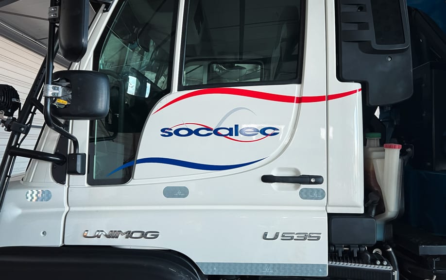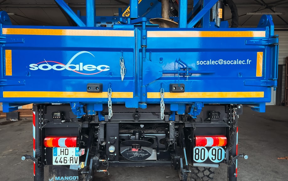Dans le cadre de l’aménagement d’un Mercedes Unimog U535, Socalec a confié à Graphitruck la réalisation d’un flocage camion grue adapté aux contraintes spécifiques d’un engin de chantier.