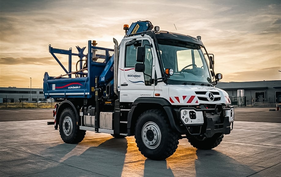 Socalec intervient dans l’aménagement et l’équipement de véhicules industriels et d’engins spécifiques destinés à des usages exigeants. Le Mercedes Unimog U535 concerné par ce projet s’inscrit pleinement dans cette logique : un camion grue conçu pour évoluer aussi bien sur route que sur chantier, avec de nombreux équipements embarqués et des éléments mécaniques en mouvement permanent.