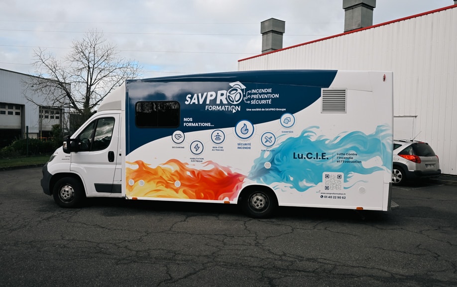 SAVPRO Formation, acteur spécialisé dans la prévention, la sécurité et les formations incendie, souhaitait renouveler l’apparence de son camion pédagogique afin de mieux valoriser son offre lors des interventions. L’ancien marquage ne reflétait plus l’ampleur de leurs activités ni la dynamique de leur identité visuelle. Le besoin portait sur un habillage intégral, capable de faire du véhicule un support attractif pour les apprenants et immédiatement reconnaissable lors des sessions sur site.