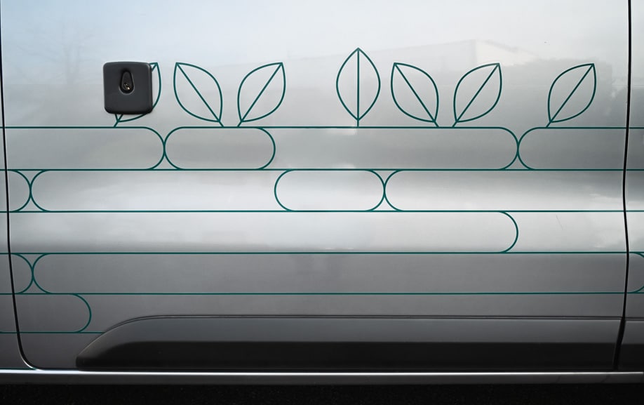Les éléments graphiques ont été produits sur des adhésifs professionnels sélectionnés pour leur tenue dans le temps. Ce choix technique assure une résistance adaptée aux contraintes rencontrées sur le terrain : exposition aux UV, variations climatiques, lavages réguliers et manipulations fréquentes autour du véhicule. Les découpes ont été réalisées avec précision afin d’éviter toute tension inutile sur les zones sensibles de la carrosserie.