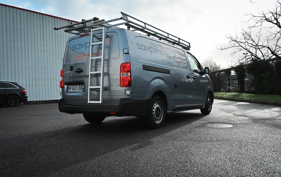 La livrée a été recalibrée sur gabarit utilitaire pour garantir une lecture fluide sur les flancs, même en situation de circulation ou à l’arrêt sur zone d’intervention. Le choix d’un habillage partiel structuré permet de valoriser la marque Sampers+ sans alourdir visuellement le véhicule. Les informations métiers essentielles — entretien, diagnostic, petits travaux, recherche de fuites — restent immédiatement identifiables, tout en conservant un rendu sobre et professionnel.