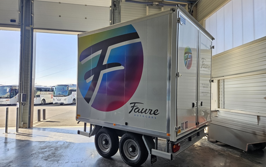 Au final, cette remorque s’intègre désormais parfaitement à l’univers graphique d’Autocars Faure Tourisme. Les logos latéraux assurent une reconnaissance immédiate de l’entreprise, tandis que le marquage arrière complète l’identification du véhicule lors des déplacements. Une réalisation simple dans sa conception, mais efficace pour maintenir une cohérence visuelle homogène à l’échelle de la flotte.