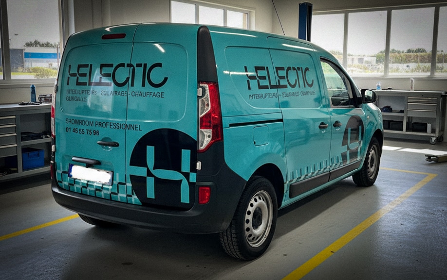 HELECTIC est un acteur reconnu dans la distribution de matériel électrique à destination des professionnels, avec un positionnement affirmé autour de l’éclairage, des interrupteurs, du chauffage et de la quincaillerie. À travers son showroom professionnel et ses déplacements réguliers sur chantiers ou chez ses clients, l’entreprise devait pouvoir s’appuyer sur un véhicule utilitaire clairement identifiable, cohérent avec son univers graphique. Le marquage devait reprendre fidèlement la charte existante tout en s’adaptant aux contraintes d’un utilitaire utilisé au quotidien. L’enjeu consistait à obtenir un rendu structuré et lisible, capable de valoriser l’image de HELECTIC sans surcharger le véhicule, tout en garantissant une homogénéité visuelle durable dans le temps.