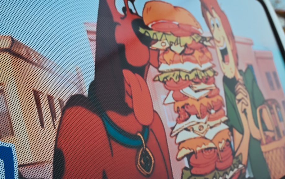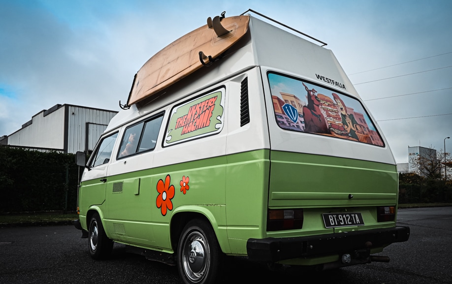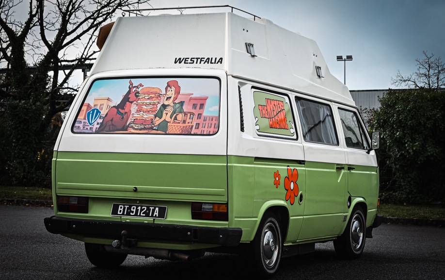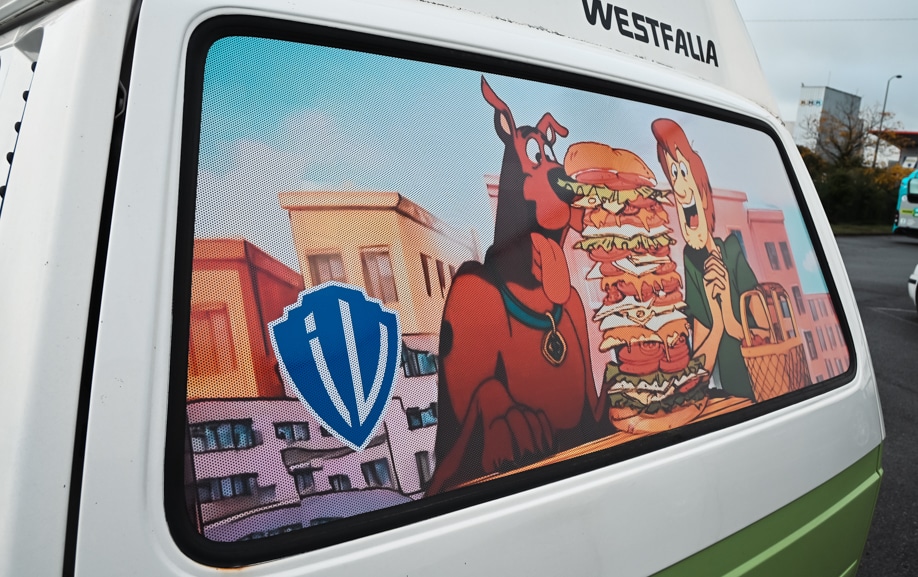 Pour répondre aux contraintes de ce projet, GRAPHITRUCK a conçu une vitrophanie sur van reposant sur l’utilisation d’adhésifs microperforés décoratifs, spécifiquement adaptés aux surfaces vitrées d’un Volkswagen Transporter T3. Le travail a débuté par une phase de conception graphique, avec l’adaptation de l’univers Scooby-Doo / Mystery Machine aux proportions réelles du véhicule. Chaque visuel a été ajusté afin d’assurer une lecture fluide depuis l’extérieur, tout en conservant une visibilité suffisante depuis l’habitacle.